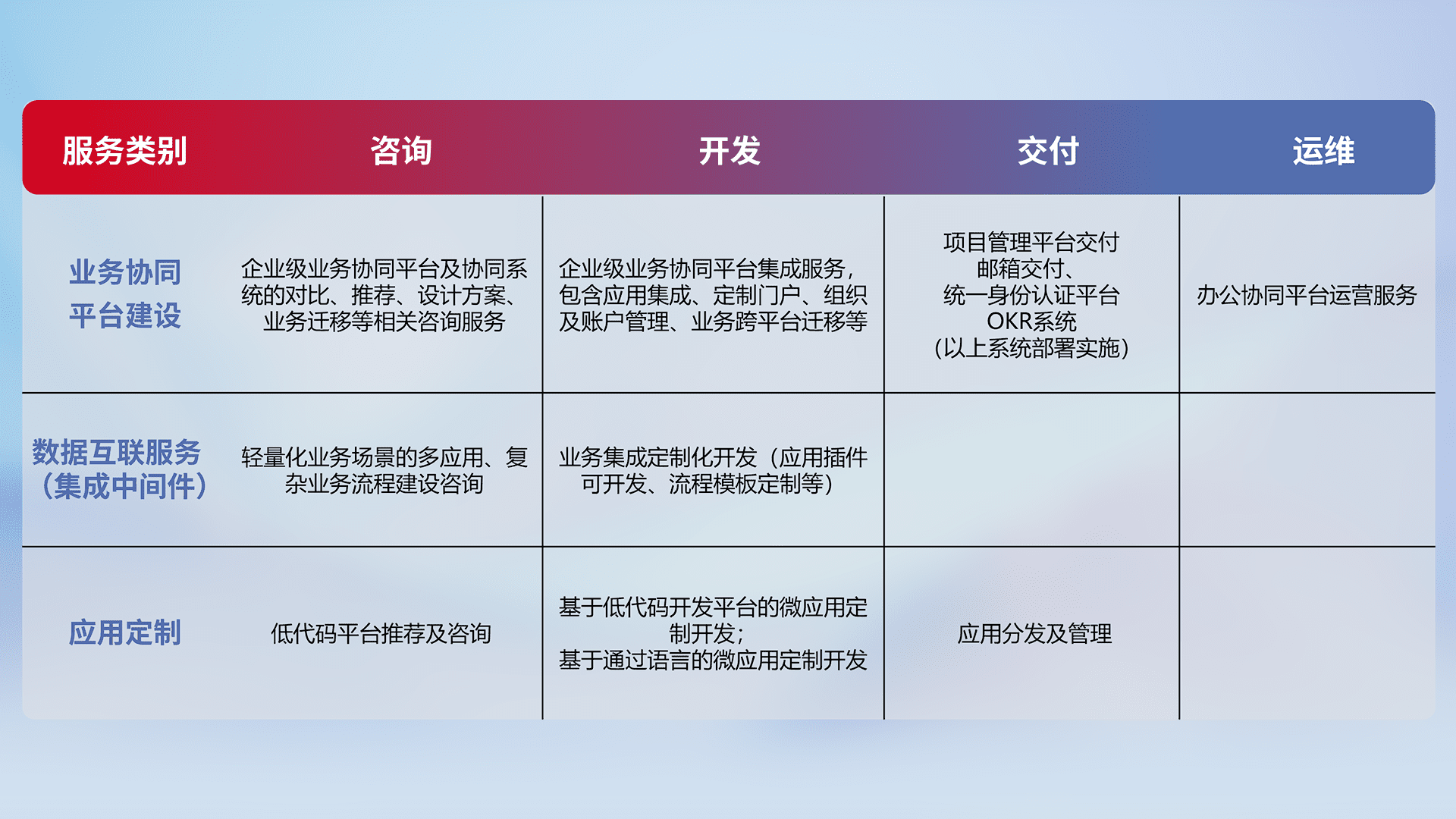 针对钉钉、、企微、、、IDaas等平台级产品提供产品的规划、、方案、、、、交付、、、定制化开发等服务,,实现如统一协同办公、、、、智能客户服务、、、混合会议管理、、、、智能数据查询、、等业务场景,,,,实现数字化转型。。。。